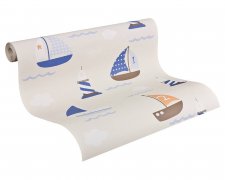 Papírová tapeta pro děti 935548 z kolekce Boys and Girls 6. Podklad dětské papírové tapety je krémový, lodičky jsou modré a hnědé.