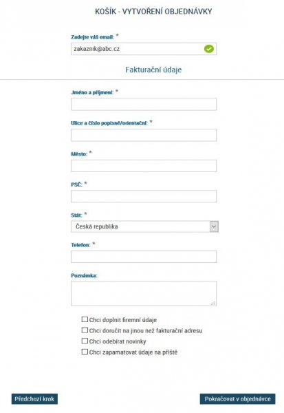 KOŠÍK 2. krok - osobní údaje - nejdříve zadejte Vaši e-mailovou adresu - prosíme, vyplňujte velmi pečlivě, jedná se o základní komunikační údaj, bez jeho správného vyplnění je velmi ztíženo hladké vyřízení Vaší objednávky. Pokud jste již registrováni, budete vyzváni k zadání hesla (případně si můžete heslo nechat zaslat znovu). Můžete ale samozřejmě objednat i bez přihlášení. Následně zadejte požadované údaje, potřebné k vyřízení objednávky, tedy jméno a příjmení, celou adresu a telefon. Můžete přidat poznámku se svým požadavkem či přáním. Při nákupu na firmu označte odpovídající pole a doplňte firemní údaje. Chcete zboží doručit na jinou adresu, než je Vaše bydliště? Označte položku a opět vyplňte požadované údaje. Pokud chcete odebírat novinky, vyberte tuto položku. V případě, že označíte pole " Chci zapamatovat údaje na příště", Vaše údaje budou zaregistrovány v systému. Díky registraci příště nebudete muset údaje vyplňovat a budete mít přístup do historie objednávek. Všechny údaje prosíme vyplňujte pečlivě a správně, je to základní předpoklad pro rychlé a bezproblémové vyřízení Vaší objednávky. Při zadávání osobních údajů můžete být absolutně bez obav - u nás jsou vaše Vaše osobní údaje v bezpečí. Využíváme nejmodernějších technologií pro ochranu dat podle standardů GDPR. Všechno máte vyplněno? Pak pojďme dál, opět zvolte vpravo dole "pokračovat v objednávce".