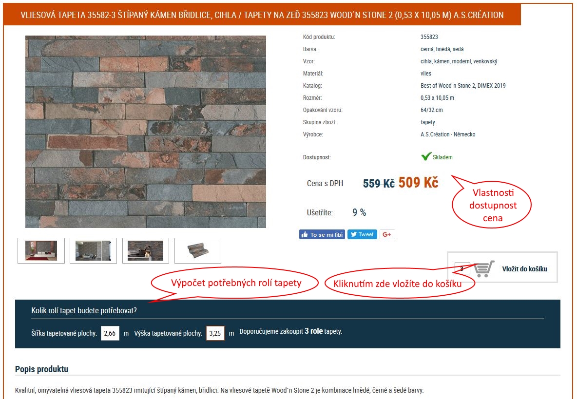 DETAIL PRODUKTU, vložení do košíku - kliknutím na obrázek nebo popis pod obrázkem zboží v kategorii se dostanete do detailu produktu. Zde naleznete podrobné informace o vybraném zboží, dostupnost, a pro inspiraci fotografie v interieru. V dolní části pak související zboží - například tapety do kombinace nebo podobného vzoru, doporučené lepidlo, nářadí atd. U tapet zde navíc naleznete aplikaci "kalkulačka tapet", kde zadáte pouze tapetovanou plochu a ihned zjistíte, kolik rolí vybrané tapety budete potřebovat. Zboží vyberete kliknutím na symbol košíku, množství můžete zvolit ihned (pokud použijete "kalkulačku tapet", bude vloženo vypočítané množství), případně počet upřesníte dodatečně v košíku. Pro jednodušší výběr doporučujeme do košíku vložit více druhů tapet (mezi kterými se rozhodujete) a následně je v košíku porovnávat ... jako při normálním nákupu. Klik a zboží máte v košíku.
