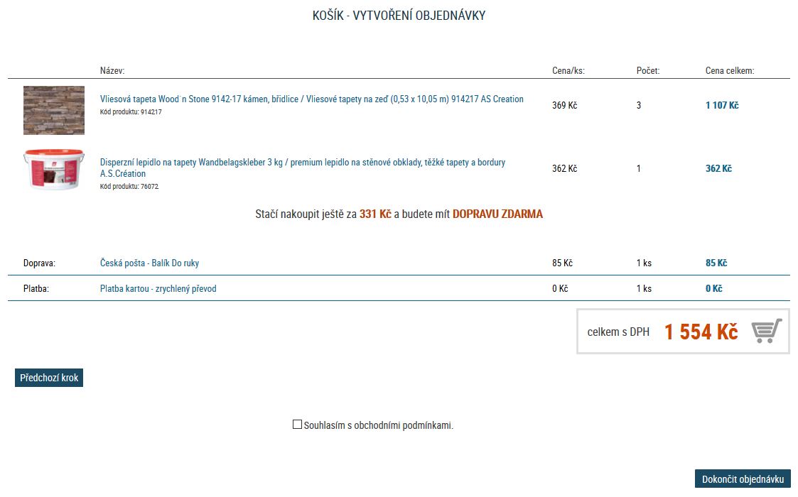KOŠÍK 1. krok - zboží, úpravy nákupu - zboží máte vloženo v košíku. Kdykoliv můžete pokračovat v nákupu kliknutí na tlačítko "zpět do e-shopu". Do košílu se dostanete kdykoliv ze všech stránek e-shopu - stačí kliknout vpravo nahoře na "Vstoupit do košíku". V košíku ale také můžete zboží porovnávat (zboží zobrazíte kliknutím na jeho obrázek nebo název), měnit jeho množství (v okénku "Počet" změňte číslo na požadované množství a zvolte "Přepočítat košík"), odstraňovat jej z košíku atd. Kdykoliv se můžete vrátit zpět do e-shopu (tlačítko vlevo dole nebo hlavní menu) a vybírat další tapety ... prostě jako v běžném kamenném obchodě. Máte-li slevový kód - vložte jej do pole pro slevový kód. Tak všechno vybráno? Tak půjdeme pomalu objednávat - začneme klikem na "Pokračovat v objednávce" vpravo dole.