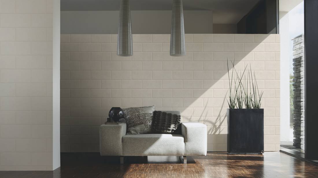 Krémově béžový obklad - moderní vliesová tapeta do bytu 343225 s 3D efektem. Vliesová tapeta z kolekce Versace 3 napodobuje kamenný obklad.