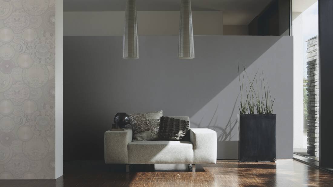 Luxusní vliesová tapeta 343274 s povrchem imitující textil. Jednobarevná vliesová tapeta z kolekce Versace 3 je v šedé barvě s leskem.