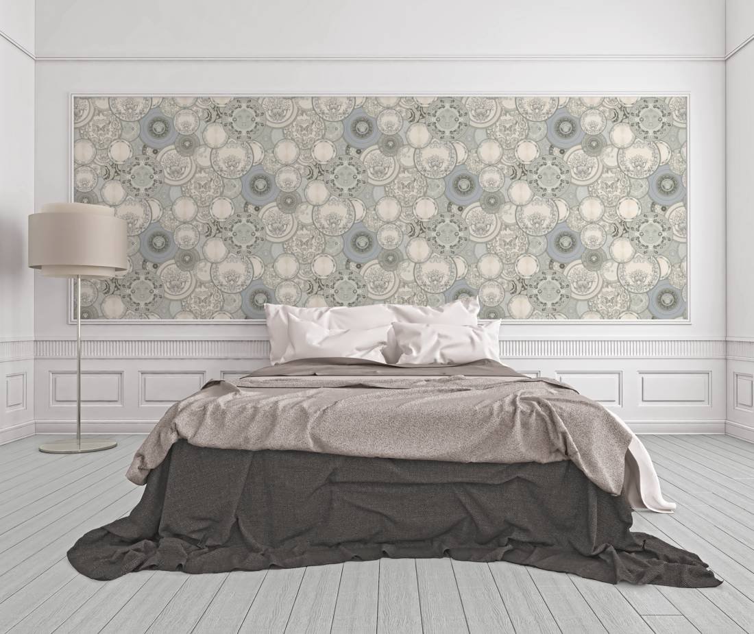 Moderní vliesová tapeta 349013 s avantgardním vzorem pochází z kolekce Versace 3. Motivy kol v různých velikostech jsou šedé, stříbrné a bílé.