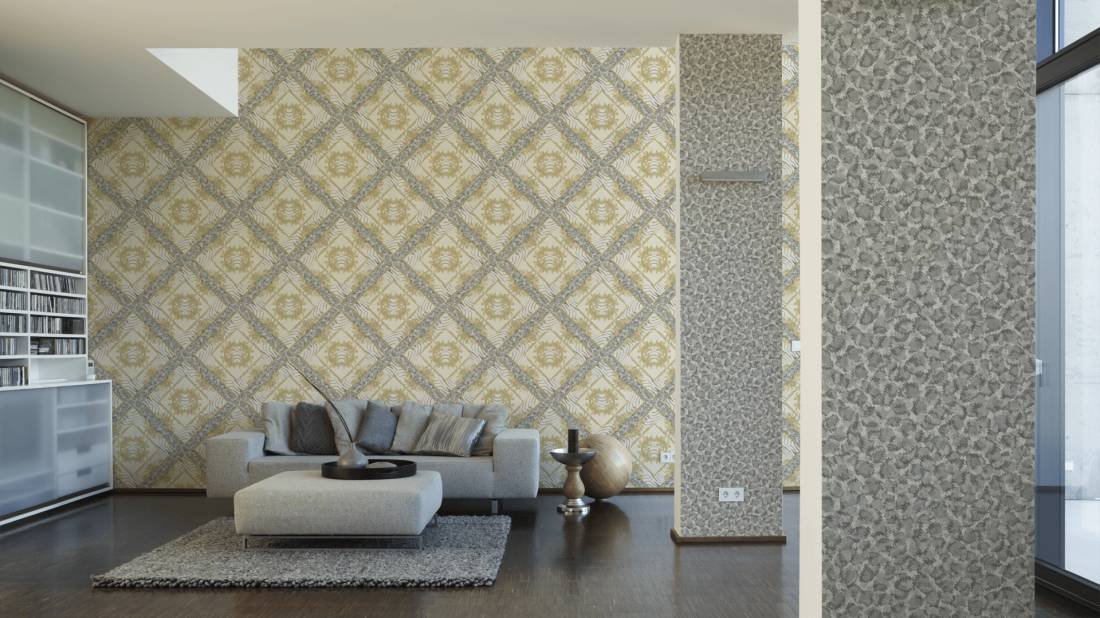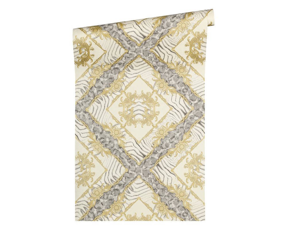 Vliesová tapeta do bytu 349042 s moderním zámeckým vzorem v krémové, šedé a metalické barvě. Luxusní vliesová tapeta pochází z kolekce Versace 3.