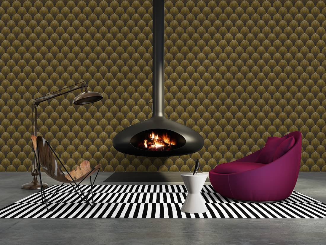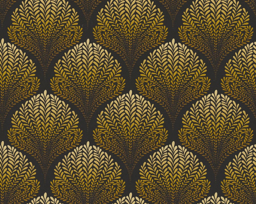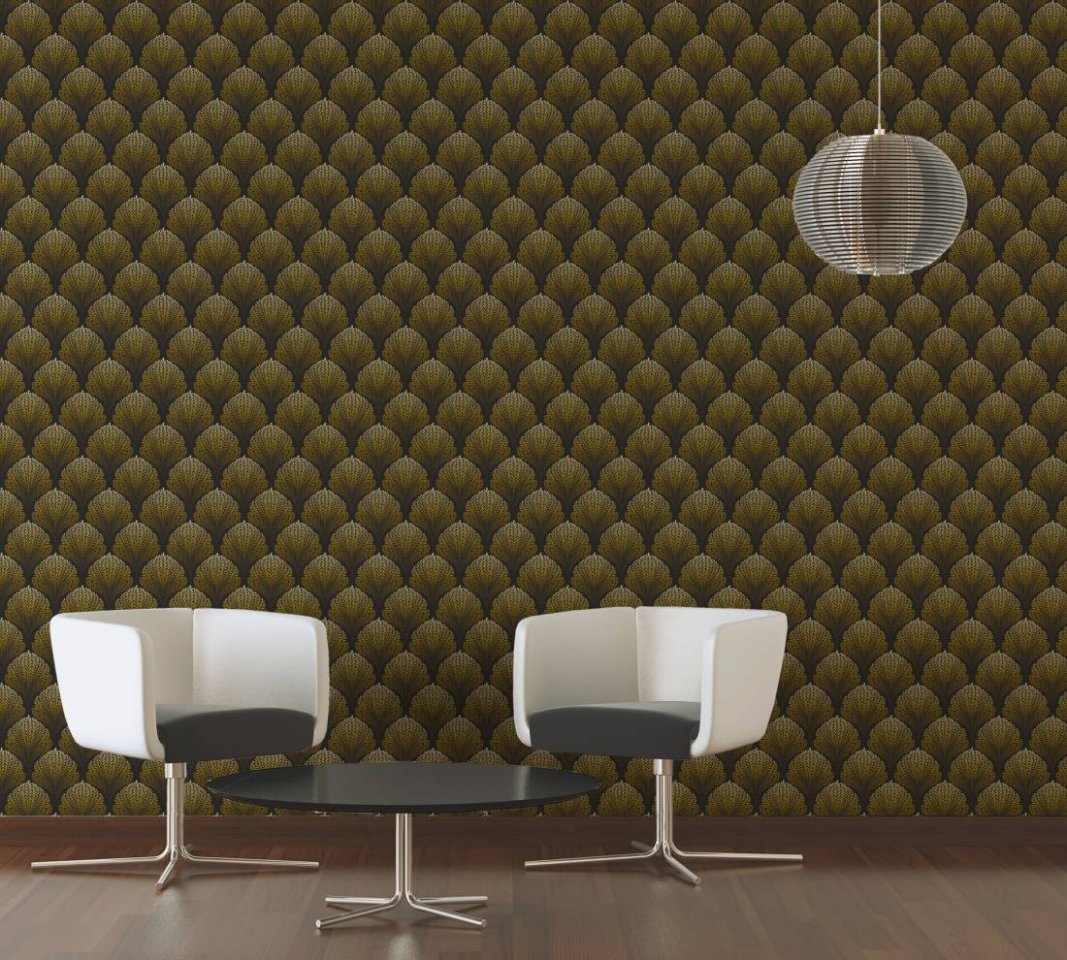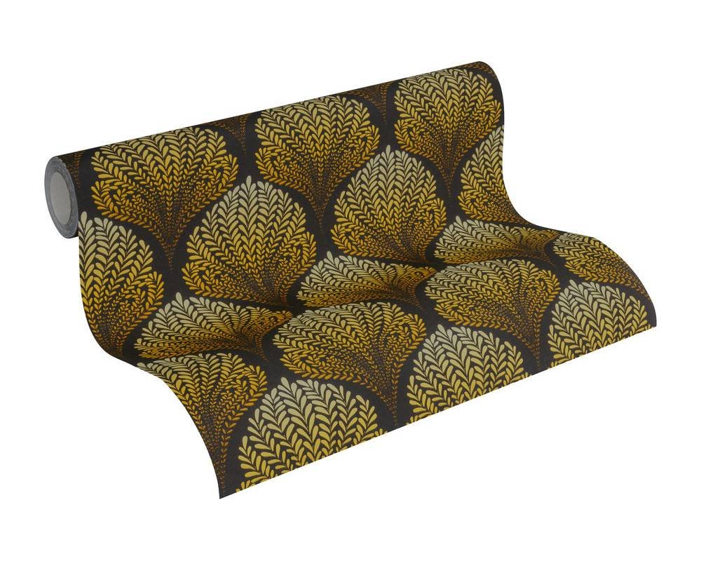Exklusivní vliesová tapeta 363106 z katalogu Palila má černý podklad. Vzor kapradí ve tvaru vějířů je v okrové barvě, která přechází do světlé žluté.