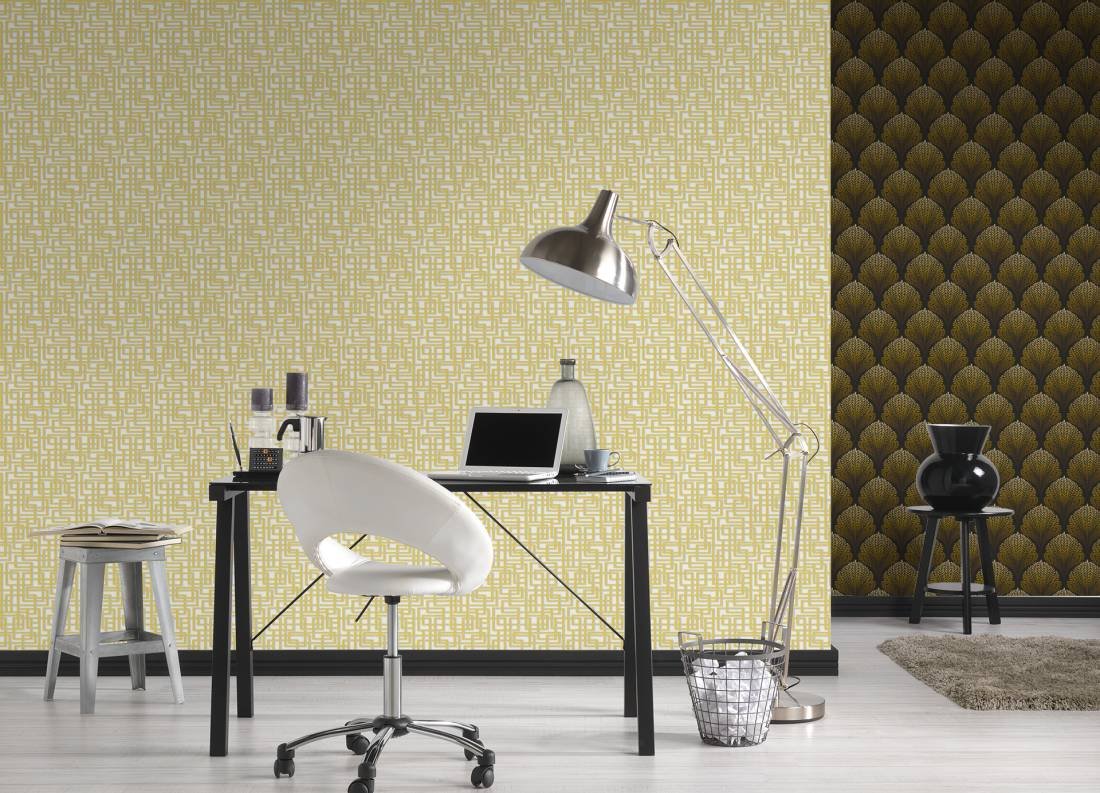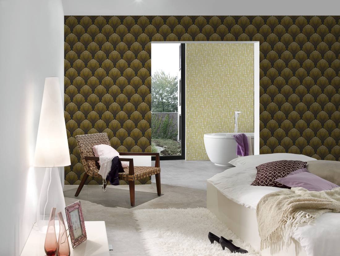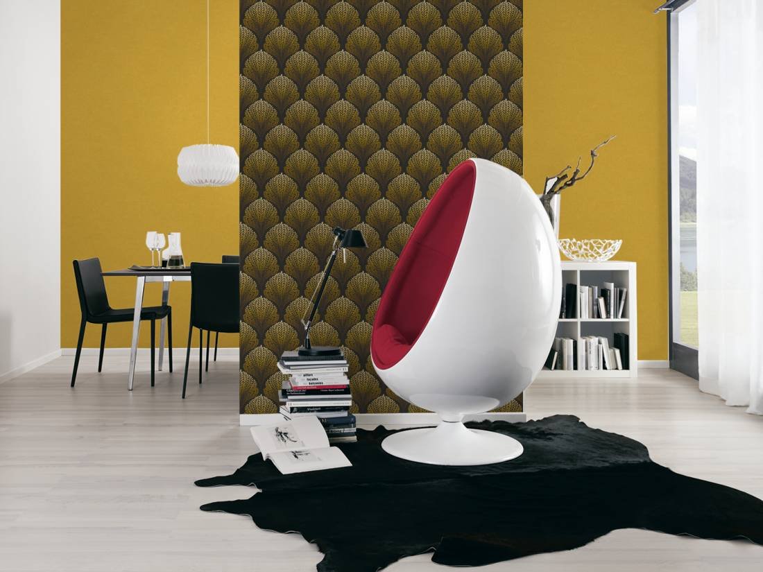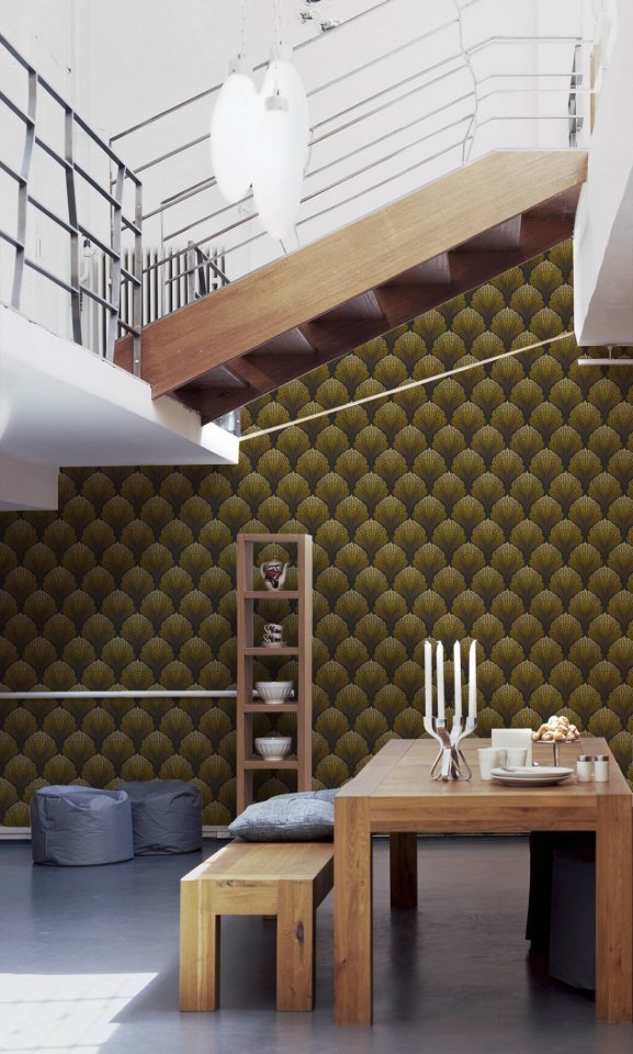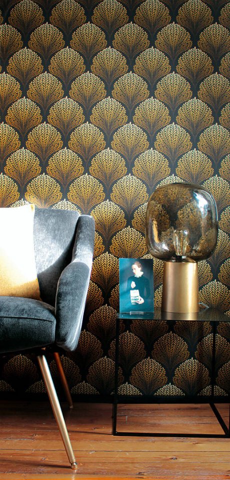 Exklusivní vliesová tapeta 363106 z katalogu Palila má černý podklad. Vzor kapradí ve tvaru vějířů je v okrové barvě, která přechází do světlé žluté.