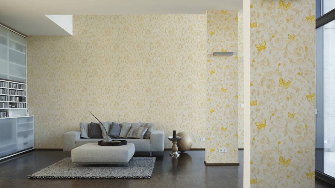 Romantická vliesová tapeta v zámeckém stylu 343251 pochází z kolekce Versace 3. Podklad a barokní vzor luxusní vliesové tapety je krémový se žlutými motýlky s leskem.