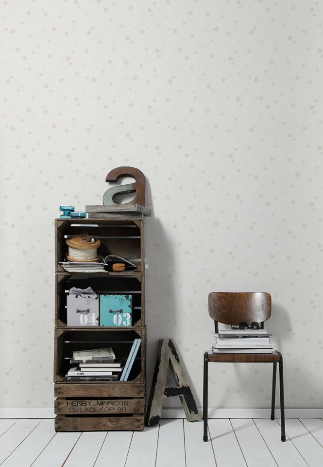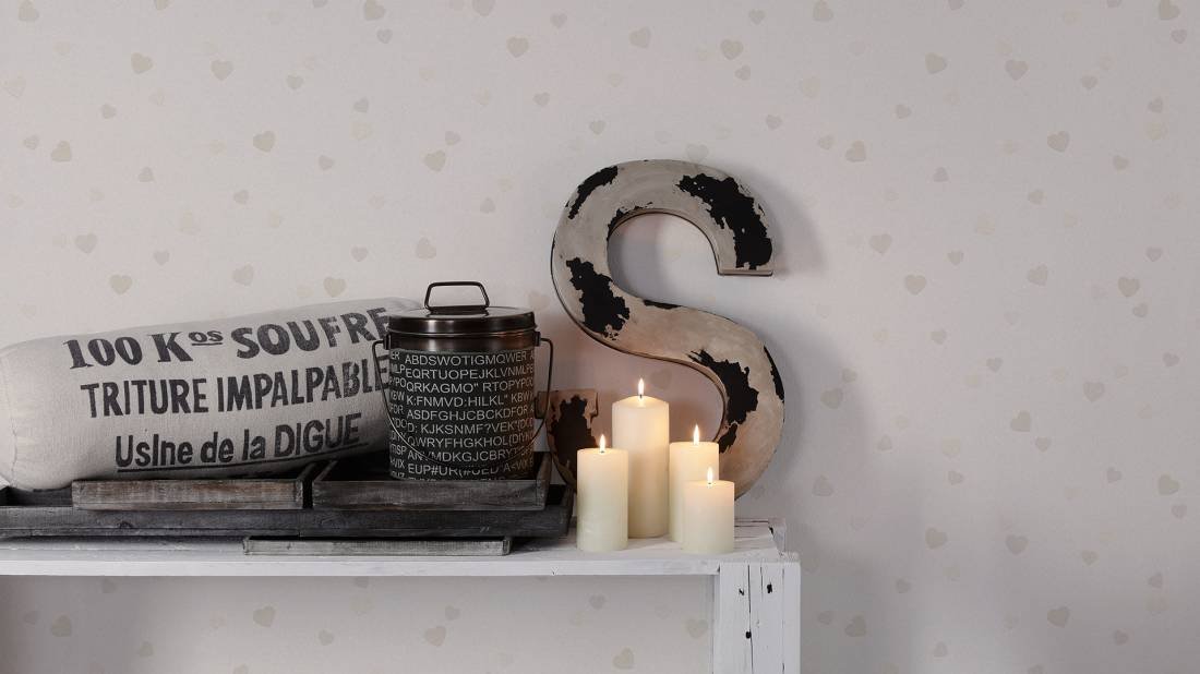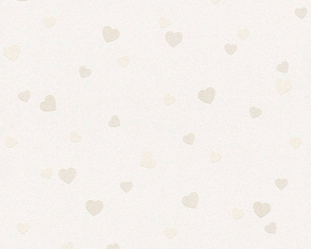 Krémová, béžová a metalická srdíčka. Něžná vliesová tapeta na stěnu 357501.
