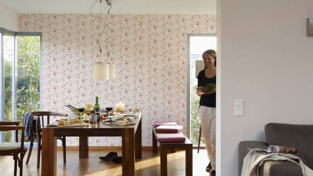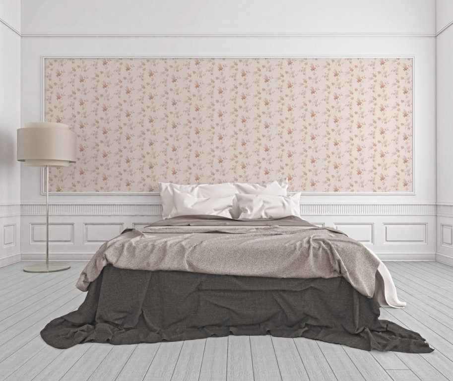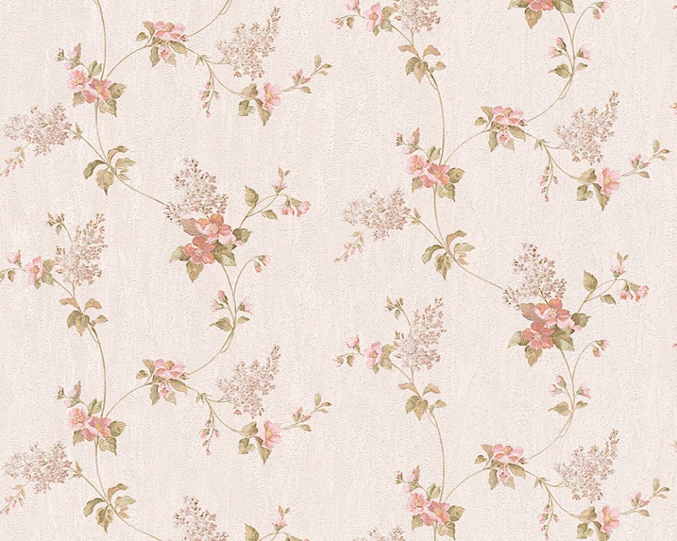 Drobné kytičky na romantické vinylové tapetě Concerto jsou v zelené a starorůžové barvě. Omyvatelná a stálobarevná vinylová tapeta 959283 pochází od známého německého ýrobce A.S.Création.