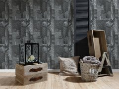 Designová vliesová tapeta na stěnu 252845 z kolekce Day and Night s motivem mrakodrapů je v černé, šedé a metalické barvě.