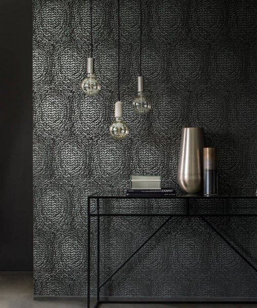 Geometrický vzor na vliesové tapetě 333734 je ve stříbrné barvě, podklad této luxusní tapety je černý. Moderní vliesová tapeta pochází z katalogu AP Alpha.