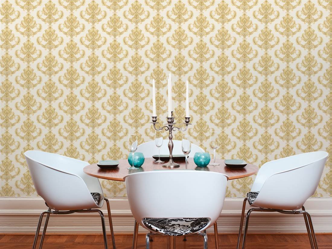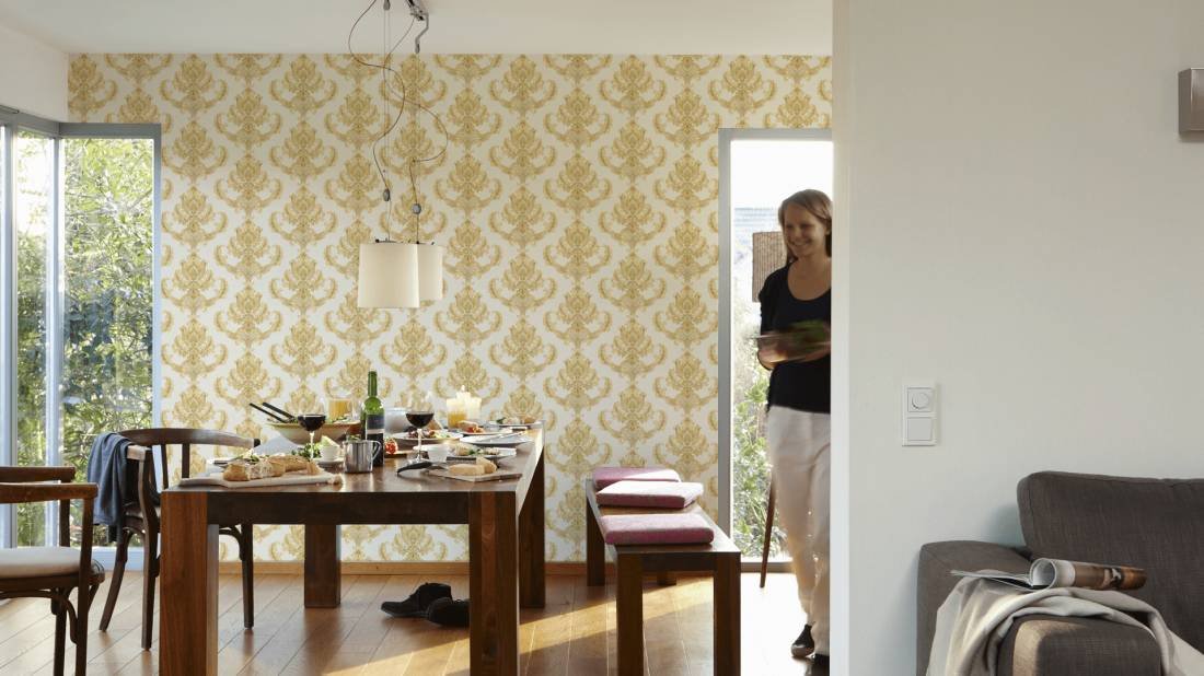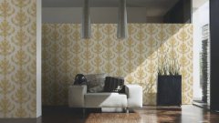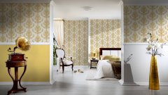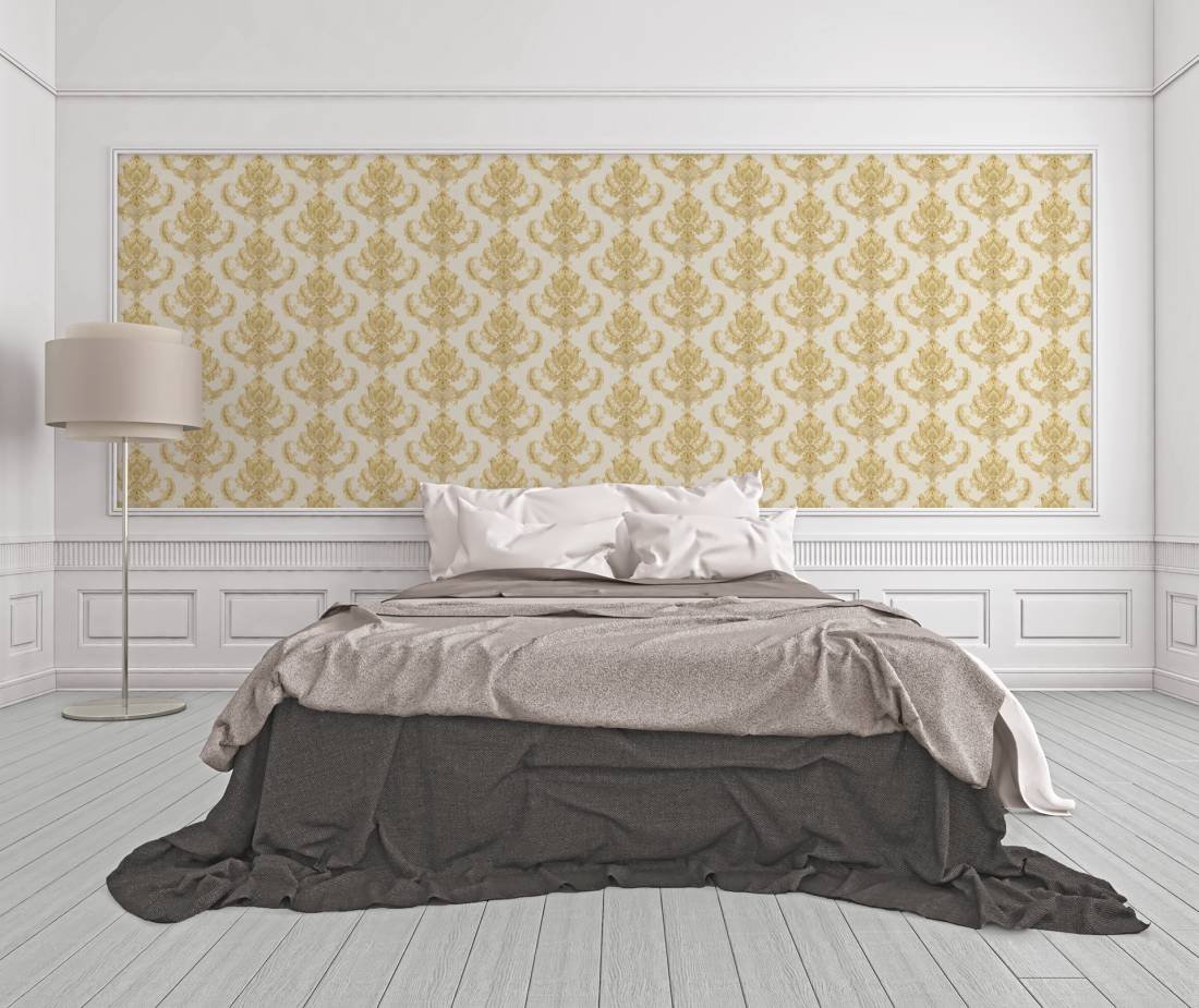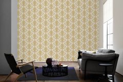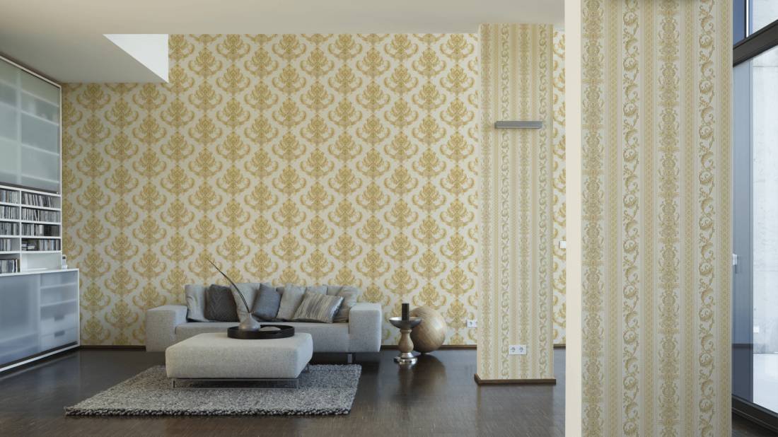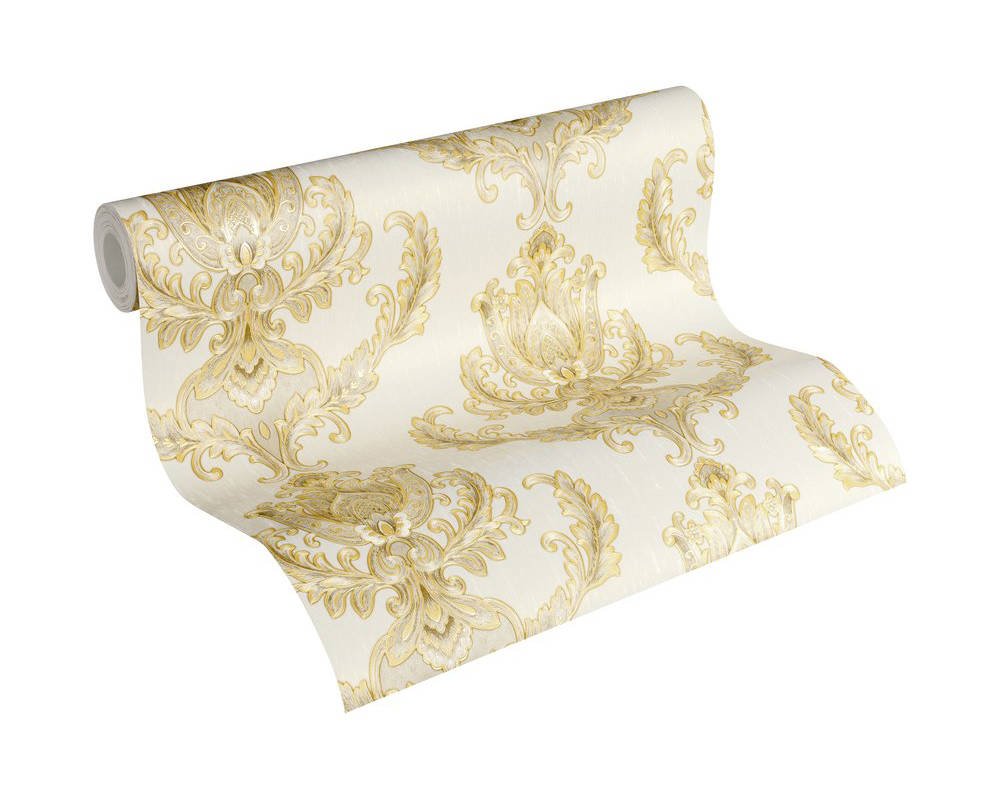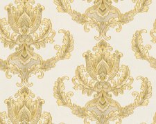 Luxusní vliesová tapeta 335463 v zámeckém stylu se zlatými barokními vzory. Podklad vliesové tapety Hermitage 10 je bílý.