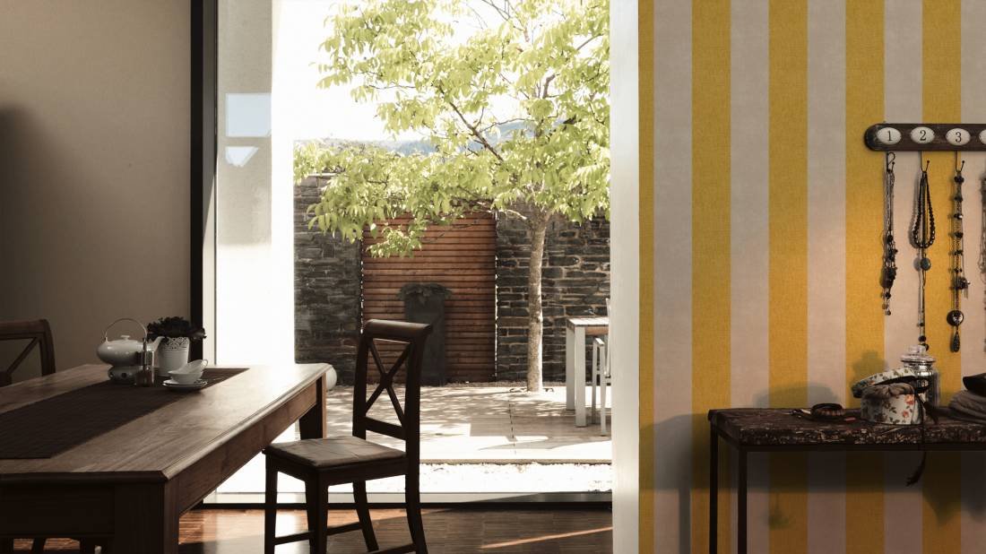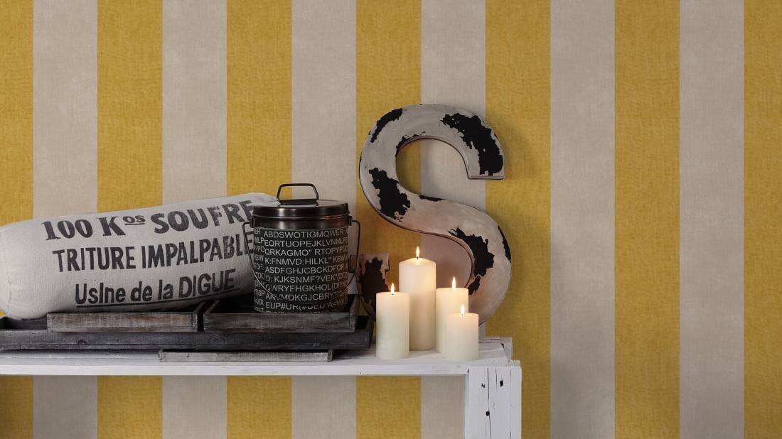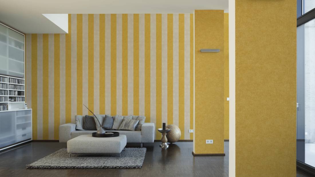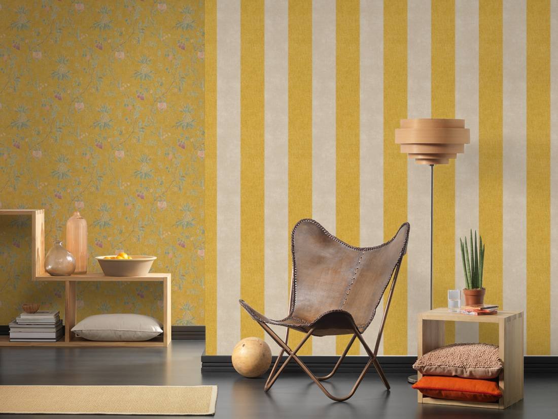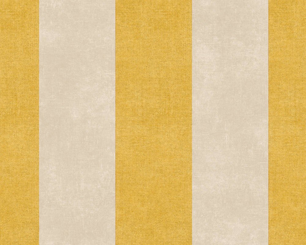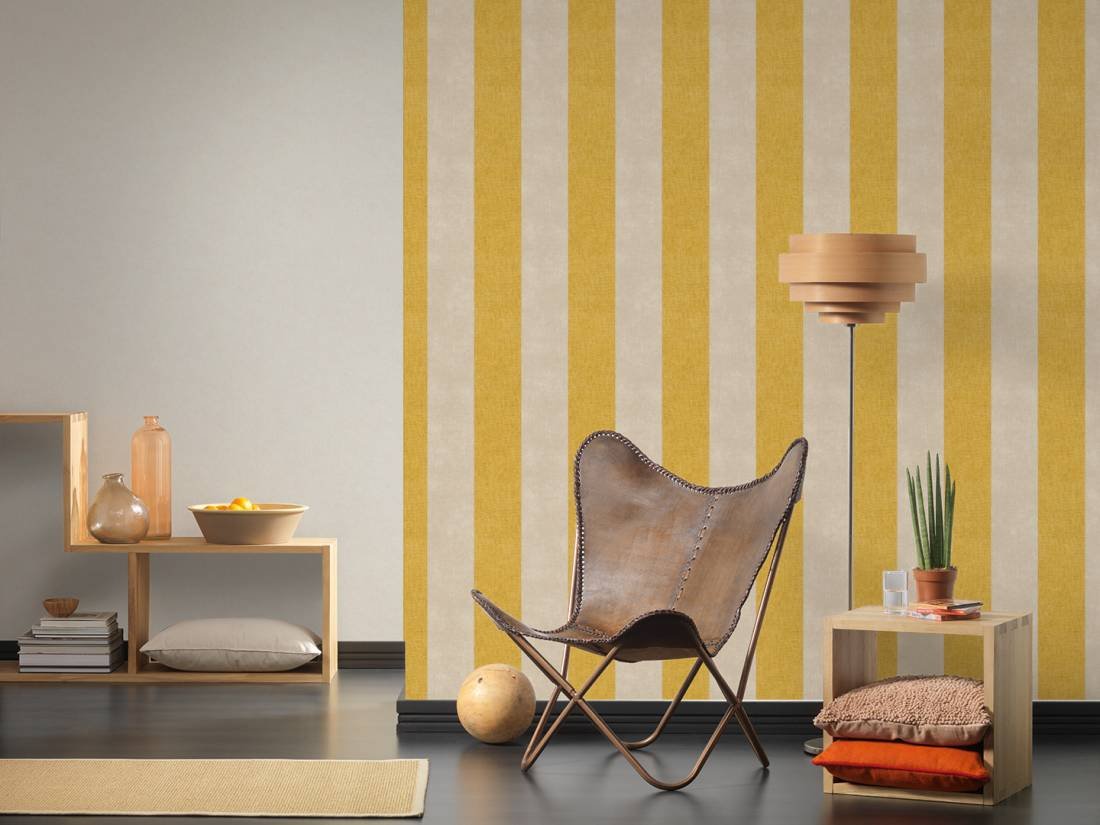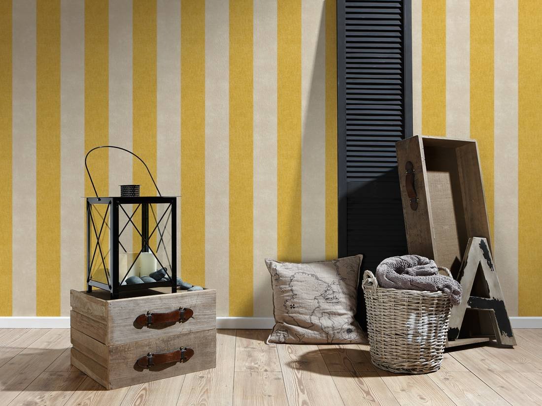 Pruhovaná vliesová tapeta 367182 z kolekce Paradise Garden. Pruhy na tapetě jsou žluté a béžové.