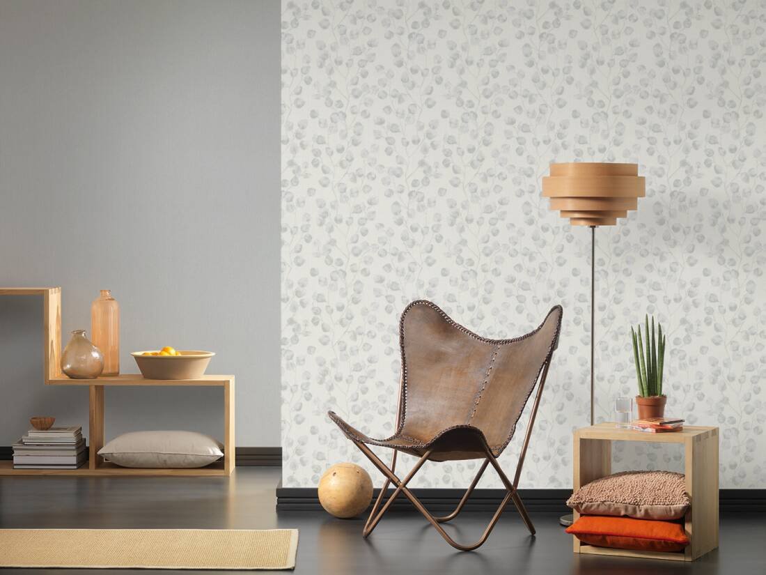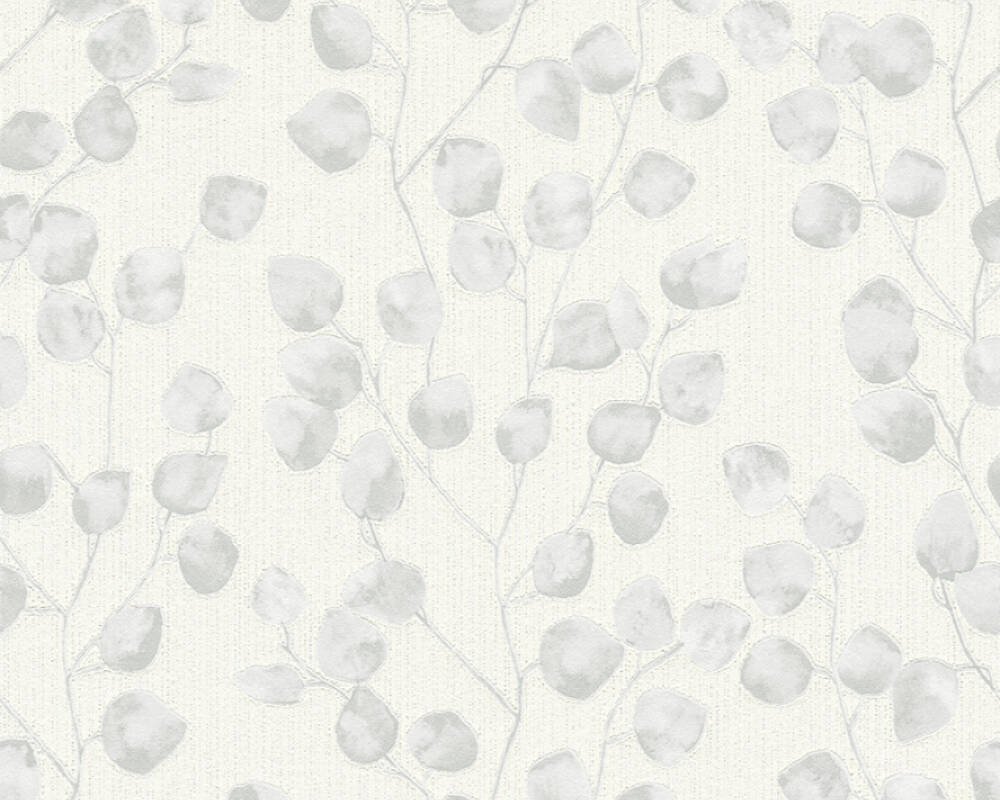 Podklad vliesové tapety do bytu 370052 je bílý. Listy na tapetě Blooming jsou šedé.