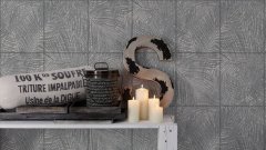 Designová vliesová tapeta z kolekce Sumatra. Vliesová tapeta 373722, palmové listy jsou v šedé barvě. Podklad vliesové tapety je bílý.