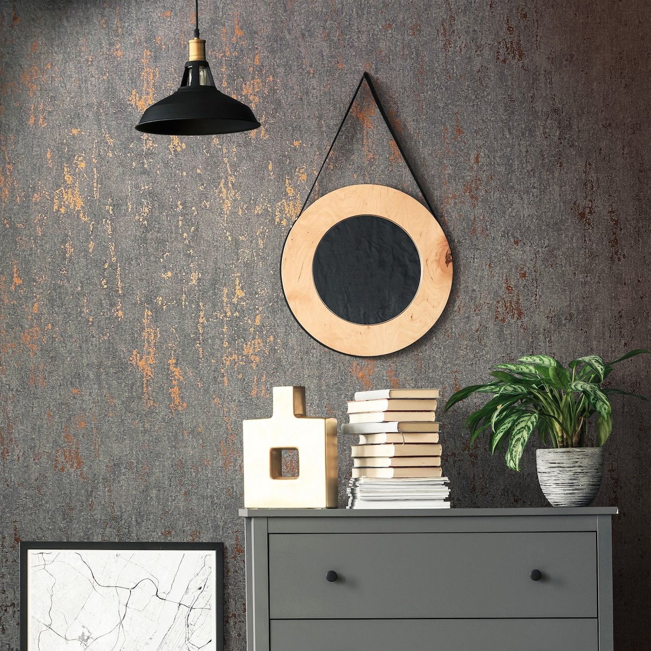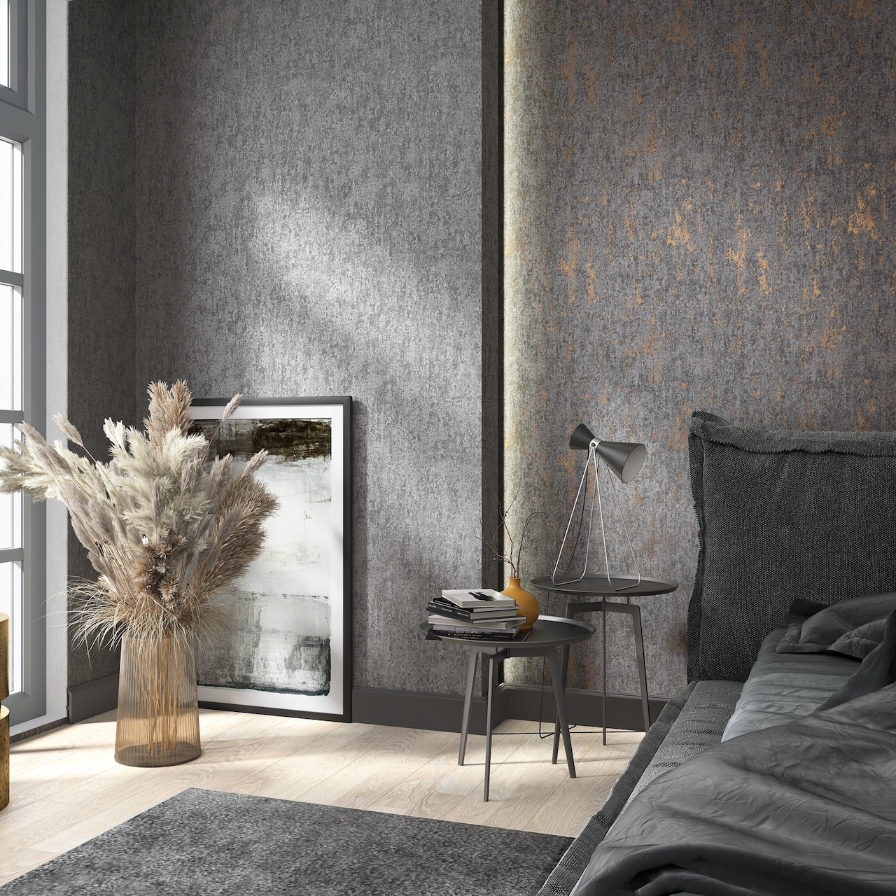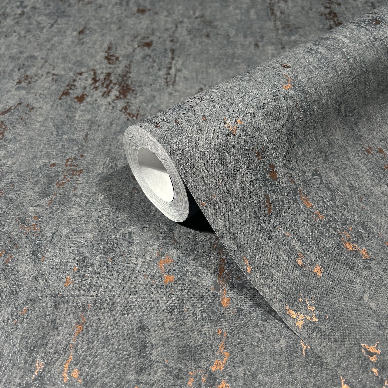 Vliesová tapeta imituje černo-měděnou betonovou stěrku, beton - výrobce Marburg - kolekce City Romance.