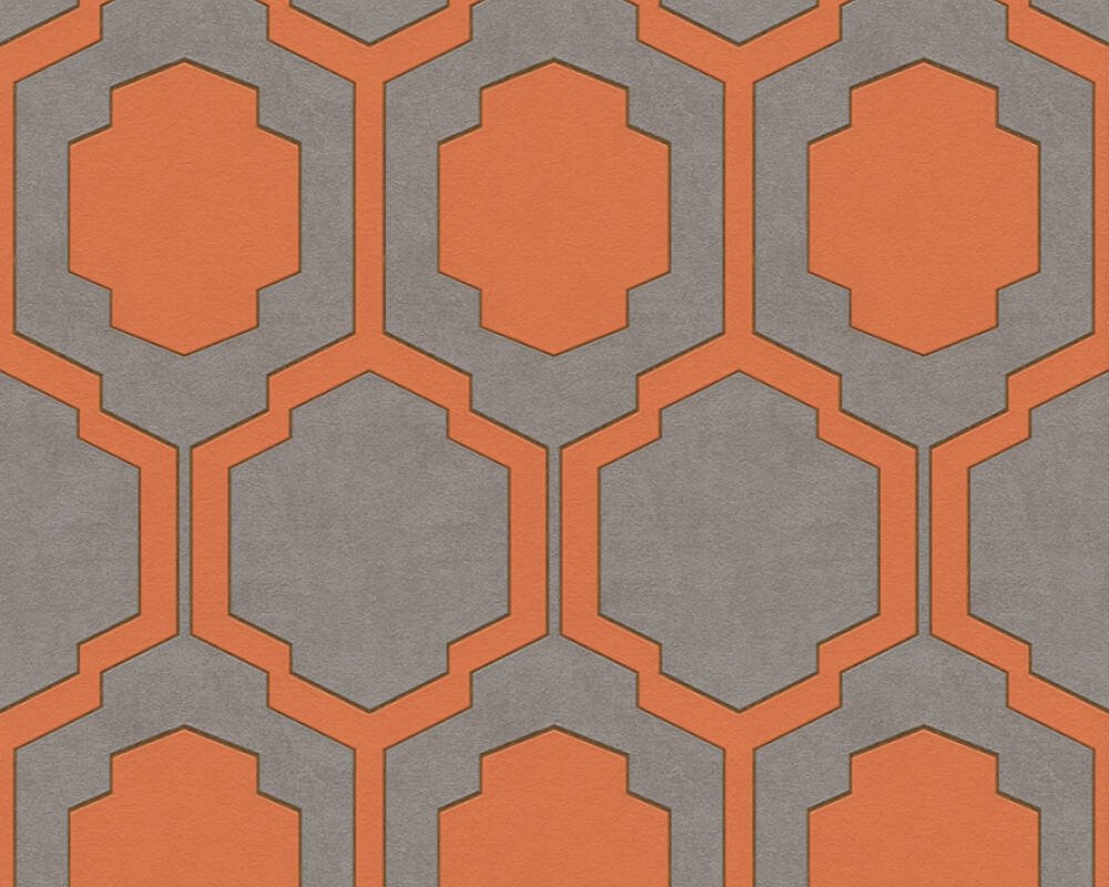 Moderní grafická vliesová retro tapeta, barva oranžová, šedá, béžová, měděná, taupe. Tapeta z kolekce Pop Style.