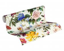Barevné květy, květiny a rostliny na bílošedém podkladu - vliesová tapeta do bytu modrá, žlutá, zelená, růžová, červená, šedá z kolekce Trendwall.