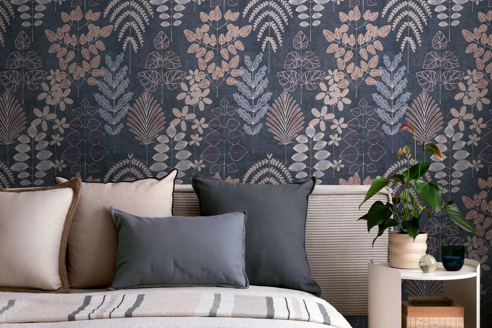 Moderní vliesová tapeta s modrými, červenými a fialovými listy - kolekce Nordic Feeling od německého výrobce tapet A.S.Création