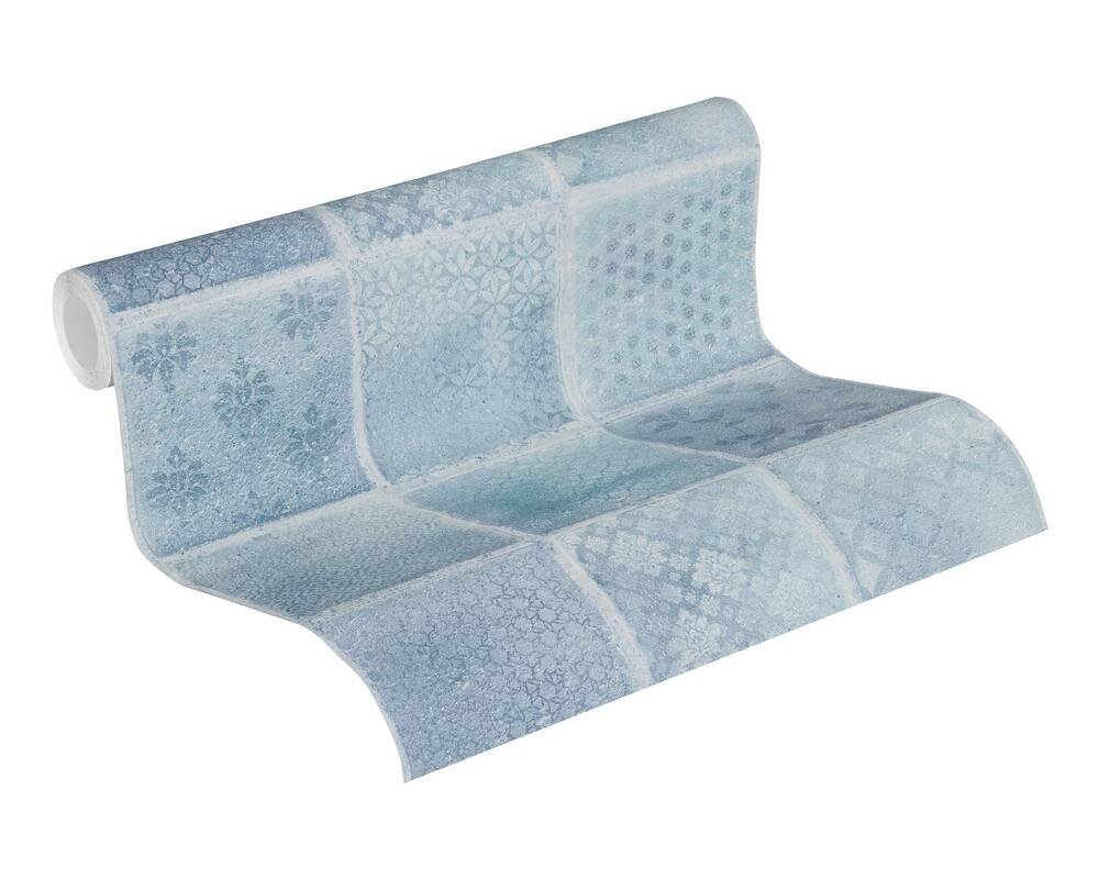 Rozměr role 0,53x10,05 m, opakování vzoru 18 cm, přímé sesazení. Barva: modrá, krémová, tyrkysová, šedá. Design: dlaždičky, kachličky, obklady, květiny, venkovský styl. Místnost: koupelna, hala, kuchyň, ložnice, obývací pokoj. Kvalita: dobrá světlostálost, vysoce omyvatelná, beze zbytku odstranitelná.