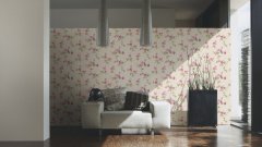Podklad vliesové tapety v moderním baroku 345014 tvoří imitace béžových kachliček s mramorováním. Na vliesové tapetě Chateau 5 jsou drobné pnoucí růže v růžové barvě se zelenými listy.